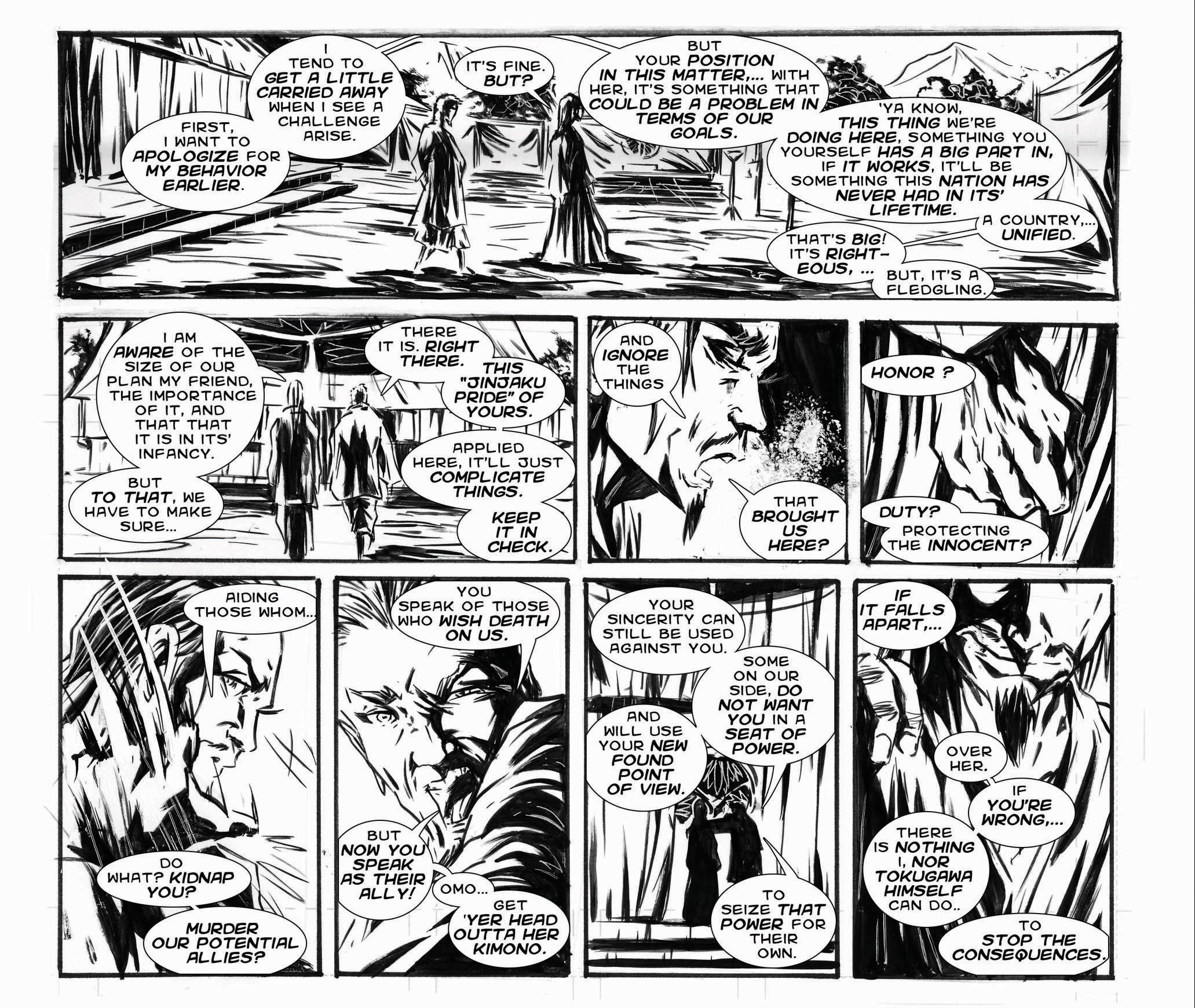 Allow me to give you an example of how I solve that issue in my work. Here’s a page where I needed to give a lot of exposition but tell it in a very short space of distance and time. A conversation between two friends/ comrades. I also went “old school” comic storytelling where the panels are text heavy, so don’t freak out,…. It was intentional.